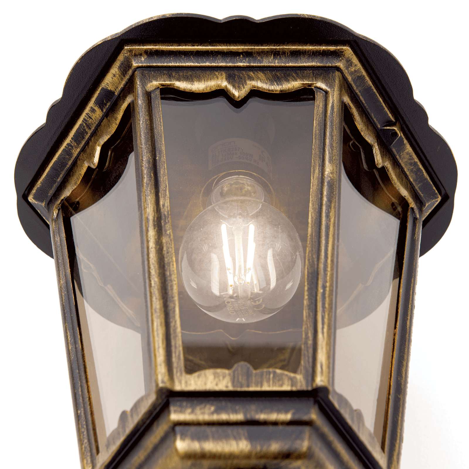 Die rustikale Wandleuchte für Gastronomie gehört zu unserer Leuchtenserie Kaprun und eignet sich mit ihrem klassisch antik rustikalen Design insbesondere sehr gut als Gastronomiebeleuchtung. Setzen Sie die sechsseitige Außenwandleuchte mit festem Wandarm und abwärts ausgerichteter Laterne als Blickfang im Hauseingang, als dekorative Terrassenbeleuchtung oder auch als stilvolle Außenbeleuchtung an Nebengelassen als dekorative Lichtquelle ein. Die dekorative Außenleuchte ist von den Maßen 22 cm breit, 45 cm hoch und 28 cm tief. Das stilvolle Ambiente entsteht bei der rustikalen Wandleuchte für Gastronomie Modell Kaprun durch die Verwendung der Farben Schwarz und Gold und die verspielten Verzierungen an der Laterne. Die stilvolle Außenleuchte Kaprun wird aus Siluminguss hergestellt, einer besonders widerstandsfähigen Aluminiumgusslegierung aus Aluguss in Verbindung mit Silicium. Silicium wird z.B. aufgrund seiner guten Materialeigenschaften auch im Flugzeugbau verwendet. Die sechs Fenstereinsätze bestehen bei dieser Wandleuchte aus Rauchglas. Die rustikale Wandleuchte für Gastronomie wird mit einer E 27-Lampenfassung geliefert. Sie bestücken die vom Design stilvolle Außenleuchte mit Leuchtmitteln bis 100 Watt Leistung. Wir empfehlen zur Bestückung ökonomische LED-Leuchtmittel oder ebenso energieeffiziente Energiesparlampen. Aus optischen Gründen bieten sich bei der stilvollen Wandlampe zur Verwendung auch moderne Retrolampen mit kugelförmigen Glaskörper an. Leuchtmittel sind bei Lieferung nicht enthalten. Die Außenwandleuchte hat ein Eigengewicht von 2,3 kg. Die Beleuchtung Kaprun entspricht der Schutzklasse 1.