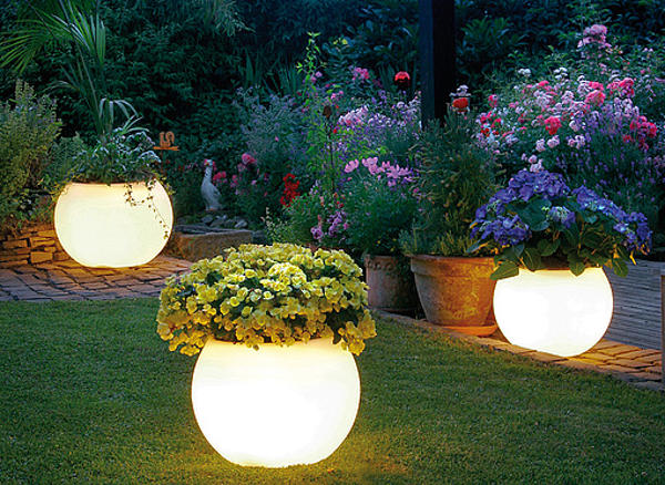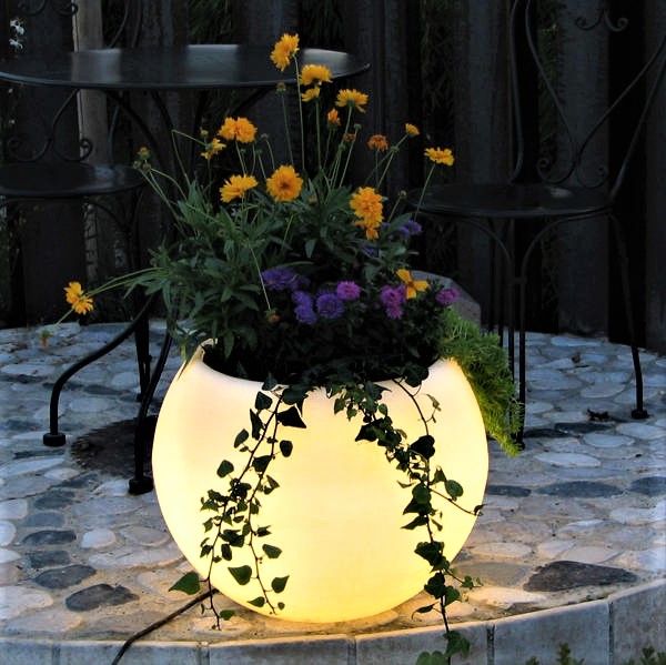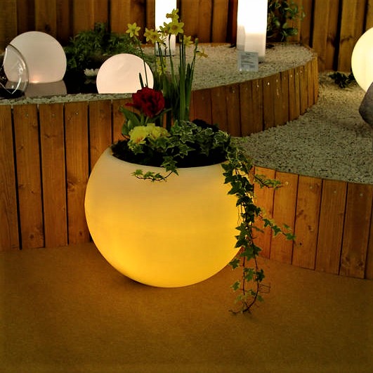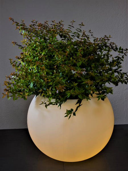 Die stilvolle Kugelleuchte 50cm ist eine Symbiose aus Natur und funktionalem Design. Das dekorative Pflanzgefäß eignet sich hervorragend als Lichtquelle für dunkle geschützte Ecken Ihrer Außenanlagen, unter Vorständen oder auch als geschmackvolle Lichtquelle für Wintergärten. Die kreative Außenbeleuchtung hat eine weißfarbene matt samtige Oberfläche. Der Korpus der stilvollen Kugelleuchte 50cm besteht aus Polyethylen und ist sowohl formstabil als auch robust. Die zwei vorhandenen Fassungen der Größe E 27 werden mit Leuchtmitteln bis 25 Watt bestückt. Wir empfehlen die Verwendung von Glühlampen, Energiesparlampen oder ökonomischen LED-Leuchtmitteln mit warm-weißem Licht für ein stimmungsvolles Ambiente. Das dekorative Pflanzgefäß verfügt über einen separaten Wasserauslass. Sie erhalten als Zubehör für die stilvolle Kugelleuchte 50cm die passende Tischplatte, das passende Sitzpolster sowie die passende Bodenbefestigung. Bitte bei Bestellung unter Bemerkungen angeben. Wenn Sie das Pflanzgefäß mit Eis füllen, eignet sich die Außenleuchte auch als Getränkekühler. Die stilvolle Kugelleuchte 50cm entspricht der Schutzart IP 22. Die funktionale Außenbeleuchtung der Serie Sun hat von den Maßen einen Durchmesser von 50 cm und ist sowohl seewasser- als auch chlorwasserbeständig. Sie können die stilvolle Aussenbeleuchtung der Serie Sun bis zu 16 cm Pflanztiefe befüllen. Sollten Sie das Pflanzgefäß im Innenraum verwenden, empfehlen wir den Wasserauslass zu schließen. Benötigen Sie ein Pflanzgefäß mit mehr Volumen, dann haben wir für Sie die stilvolle Aussenleuchte Sun mit einer Pflanztiefe von 20,5 cm im Angebot. Schauen Sie sich doch auch mal das größere Pflanzgefäß mit Beleuchtung an, unsere stivolle Aussenbeleuchtung Sun.