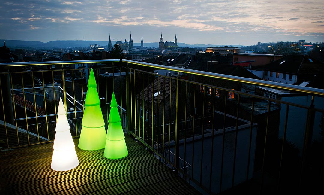 Unsere weiße Aussenbeleuchtung Design-Baum passt perfekt als weihnachtlich-winterlich beleuchtete Außendekoration im Terrassenbereich, im Vorgarten oder als auflockernde moderne Beetbeleuchtung. Der elegante Licht-Tannenbaum wirkt dabei puristisch und setzt als rundförmiger Leuchtkegel tolle Lichtakzente. Der kegelförmige beleuchtete 3D-Baum ist von den Maßen 100 cm hoch und 39 cm breit. Die verwendete E 27-Lampenfassung wird hier standardmäßig inklusive einem LED-Leuchtmittel Lichtfarbe Warm-weiß geliefert. Dank der Fernbedienung können Sie die originelle Weihnachtsbeleuchtung auch in der Farbintensität 5-stufig dimmen. Das verwendete Leuchtmittel ist sehr langlebig und später ohne viel Aufwand leicht austauschbar. Dazu werden lediglich drei Schrauben gelöst und das Leuchtmittel ausgedreht und ersetzt. Die in der Form geometrische Aussenleuchte kann sowohl für den Innen- als auch Außenbereich als Beleuchtung und stilvolles Dekorationsobjekt eingesetzt werden.