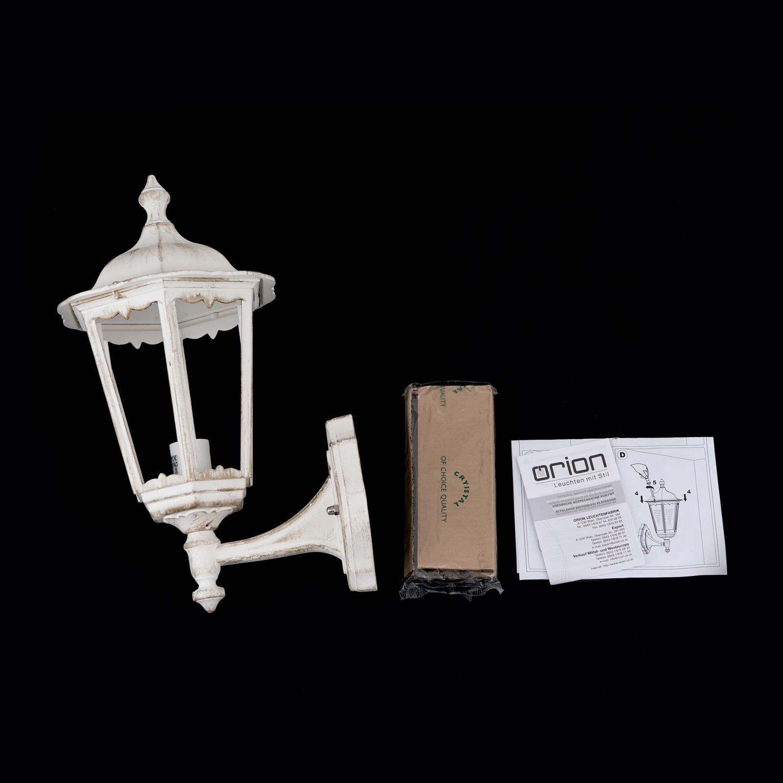 Die weiße Außenwandleuchte antik lässt sich perfekt mit anderen Leuchtenarten aus dieser Leuchtenserie ergänzen. Die formschöne weiße Außenleuchte wird mit einer E 27-Lampenfassung geliefert. Sie bestücken die weiße Außenleuchte mit Leuchtmitteln bis 100 Watt Leistung. Wir empfehlen zur Bestückung ökonomische LED-Leuchtmittel oder stromsparende Energiesparlampen. Leuchtmittel sind bei Lieferung nicht enthalten. Aus optischen Gründen bieten sich bei der Leuchte zur Verwendung auch moderne Retrolampen mit kugelförmigenn Glaskörper an. Zaubern Sie damit tolle Lichtmomente in Ihre Umgebung. Die dekorative Outdoor-Wandleuchte Graz mit aufrechter Laterne stammt von unserem österreichischen Hersteller Orion-Leuchten. Die Außenleuchte entspricht der Schutzklasse 1. Die weiße Außenwandleuchte antik eignet sich mit der Schutzart IP 43 gut für den Außenbereich, sollte aber etwas wettergeschützt, z.B. unter einem Dachkasten, als Lichtquelle eingesetzt werden. Der östereichische Hersteller Orion-Leuchten gibt auf die Außenleuchte ab Werk 2 Jahre Garantie. Die weiße Wandlaterne ist nicht dimmbar. Kombinieren Sie die stilvolle Wandleuchte doch mit der weißen Sockelleuchte antik, ebenfalls aus unserer Leuchtenserie Graz.