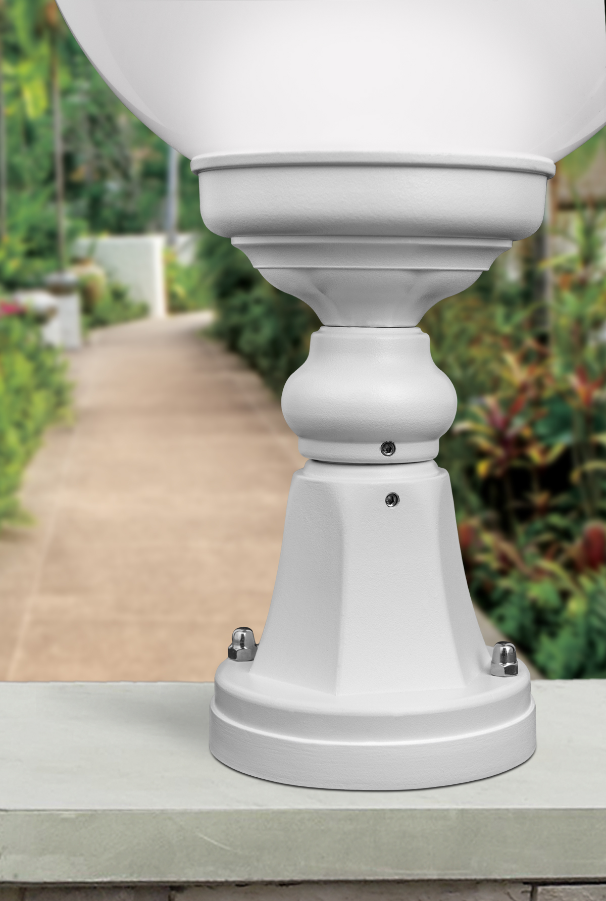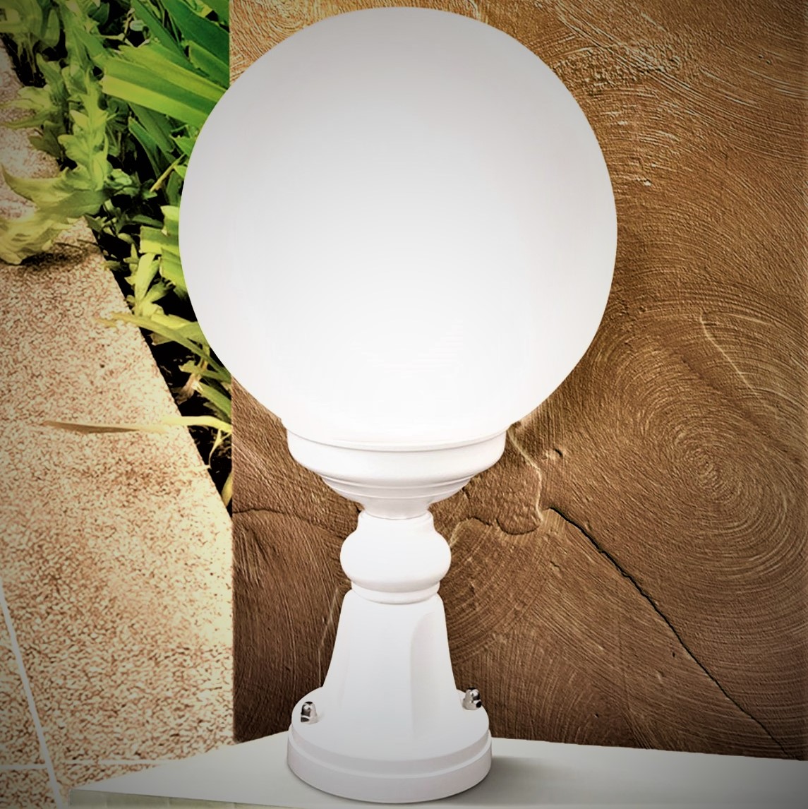 Unsere weiße Sockelleuchte klassisch Modell Salzburg überzeugt optisch mit einer klassisch weißen Kugelhaube und dem dazu im farblichen Einklang stehenden weißen Sockelfuß. Die Einsatzmöglichkeiten der rundförmigen Gartenleuchte sind vielfältig. Die klassisch weiße Gartenleuchte eignet sich auch als Gastronomiebeleuchtung im Wintergarten oder auf der Terrasse als Lichtquelle mit Flair. Die Außenleuchte eignet sich als Wegeleuchte, als Außenbeleuchtung für Podeste, Mauerabsätze, Treppenabsätze oder auch sehr gut als romantische Terrassenbeleuchtung. Setzen Sie mit der Kugel-Sockellampe Linz geschmackvolle Lichtakzente in Ihrem Außenbereich.
