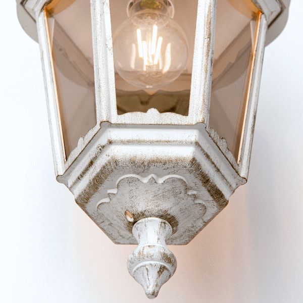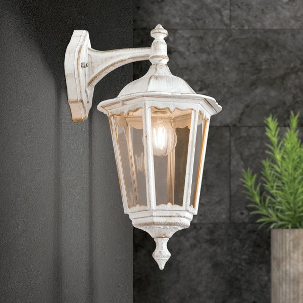 Die weiße Wandlaterne antik eignet sich als stilvolle Außenbeleuchtung im Hauseingang, als dekorative Terrassenbeleuchtung oder auch als klassisch-antike Wandlampe an Nebengelassen wie Schuppen oder Carport/Garage. Die Außenwandeuchte passt vom Design unter anderem optisch sehr gut zu weiß geklinkerten Häusern und einem klassischen Baustil. Das besondere Flair entsteht bei der Leuchte durch die Verbindung der klassischen Farben Weiß und Gold. Die abwärts gerichtete Außen-Wandlaterne ist von ihren Maßen 45 cm hoch, 22 cm breit und 28 cm tief. Die Außenwandleuchte hat ein Eigengewicht von 2,3 kg. Die stilvolle Gartenbeleuchtung Modell Graz wird aus Siluminguss hergestellt, einer besonders widerstandsfähigen Aluminiumgusslegierung aus Aluguss in Verbindung mit Silicium. Silicium wird z.B. aufgrund seiner guten Materialeigenschaften auch im Flugzeugbau verwendet. Die Laternen-Fenstereinsätze werden aus Rauchglas gefertigt. Rauchglas erfreute sich bereits in den 60-iger Jahren großer Beliebtheit und war in der Beleuchtung innen als außen voll im Trend.